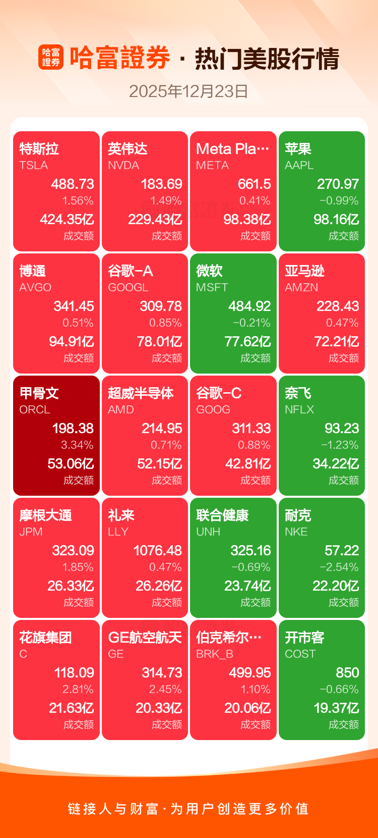 特斯拉涨1.56%,英伟达涨1.49%,Meta Platforms Inc-A涨0.41%,苹果跌0.99%,博通涨0.51%,谷歌-A涨0.85%,微软跌0.21%XM中文官网,亚马逊涨0.47%,甲骨文涨3.34%,超威半导体涨0.71%。