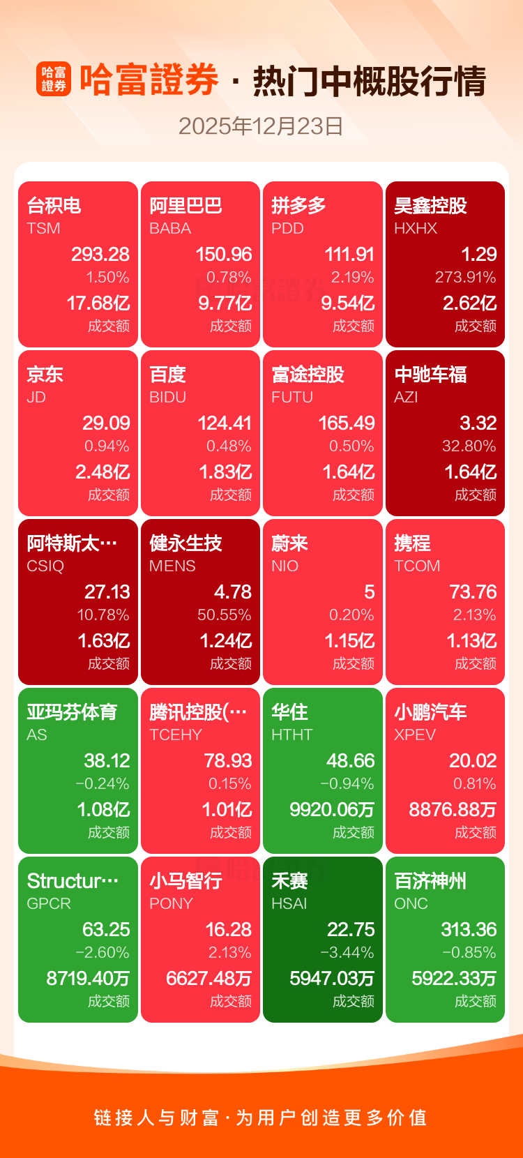 台积电涨1.50%,阿里巴巴涨0.78%,拼多多涨2.19%,昊鑫控股涨273.91%,京东涨0.XM中文官网94%,百度涨0.48%,富途控股涨0.50%,中驰车福涨32.80%,阿特斯太阳能涨10.78%,健永生技涨50.55%。