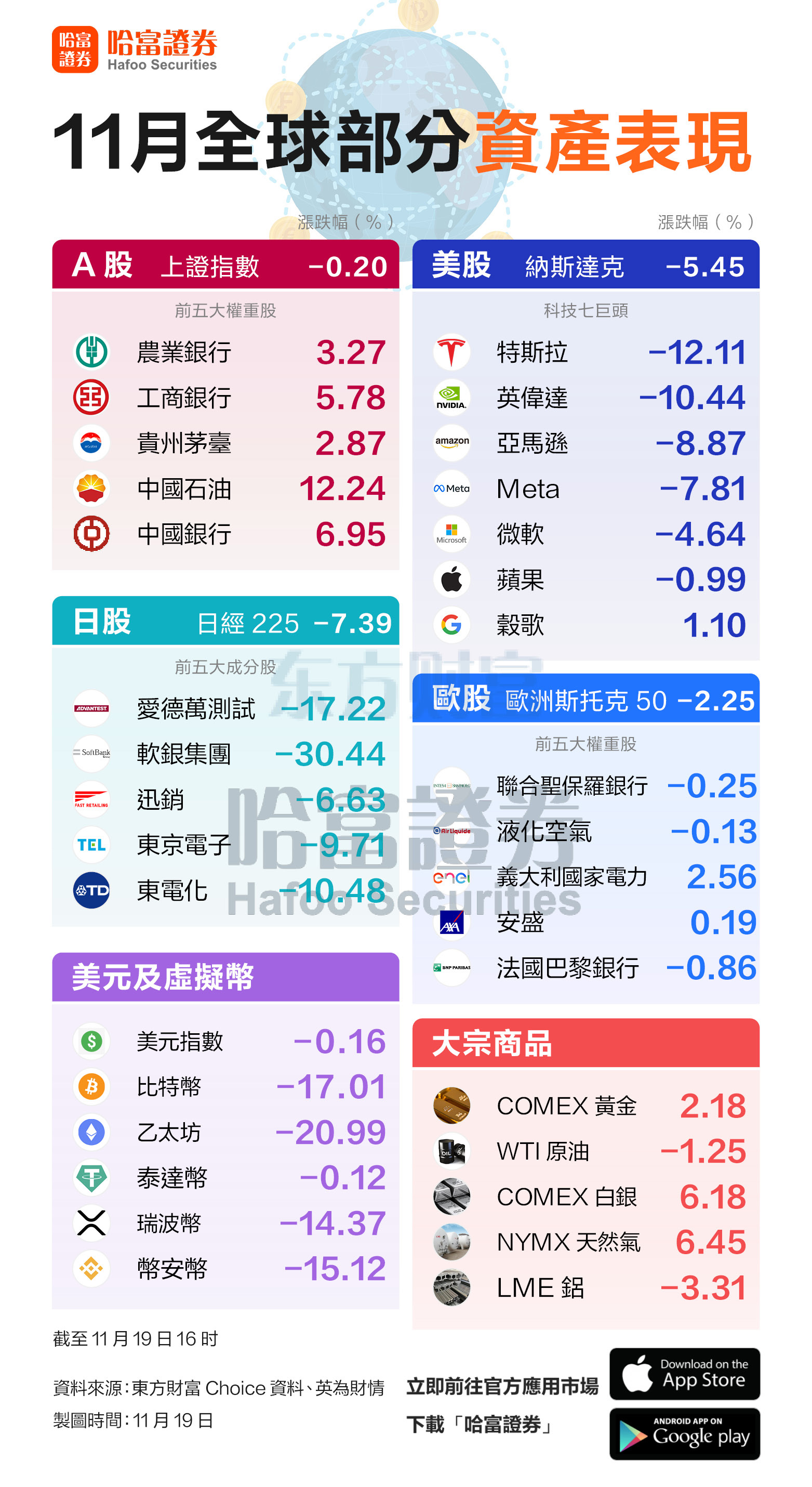 进入11月以后,全球金融市场动荡,美股、日股、欧股、虚拟币、A股等全球主要资产均出现调整。截至北京时间11月19日16时,纳指当月跌超5%,日经225大跌7.39%,欧洲斯托克50下跌2.25%,XM中文官网沪指及恒指微跌约0.2%,比特币当月暴跌17%。