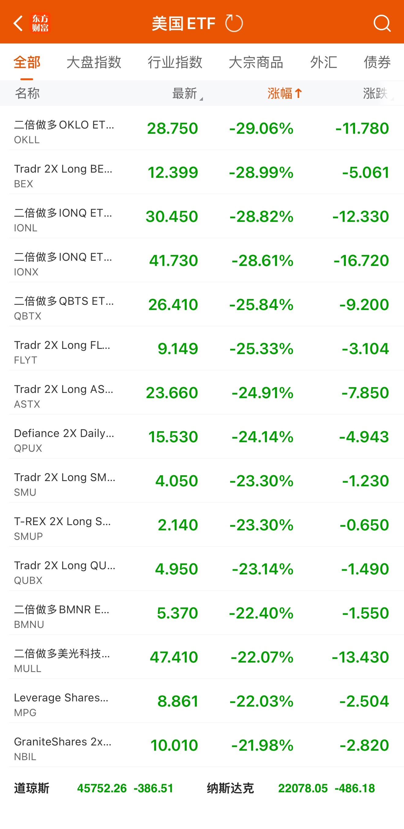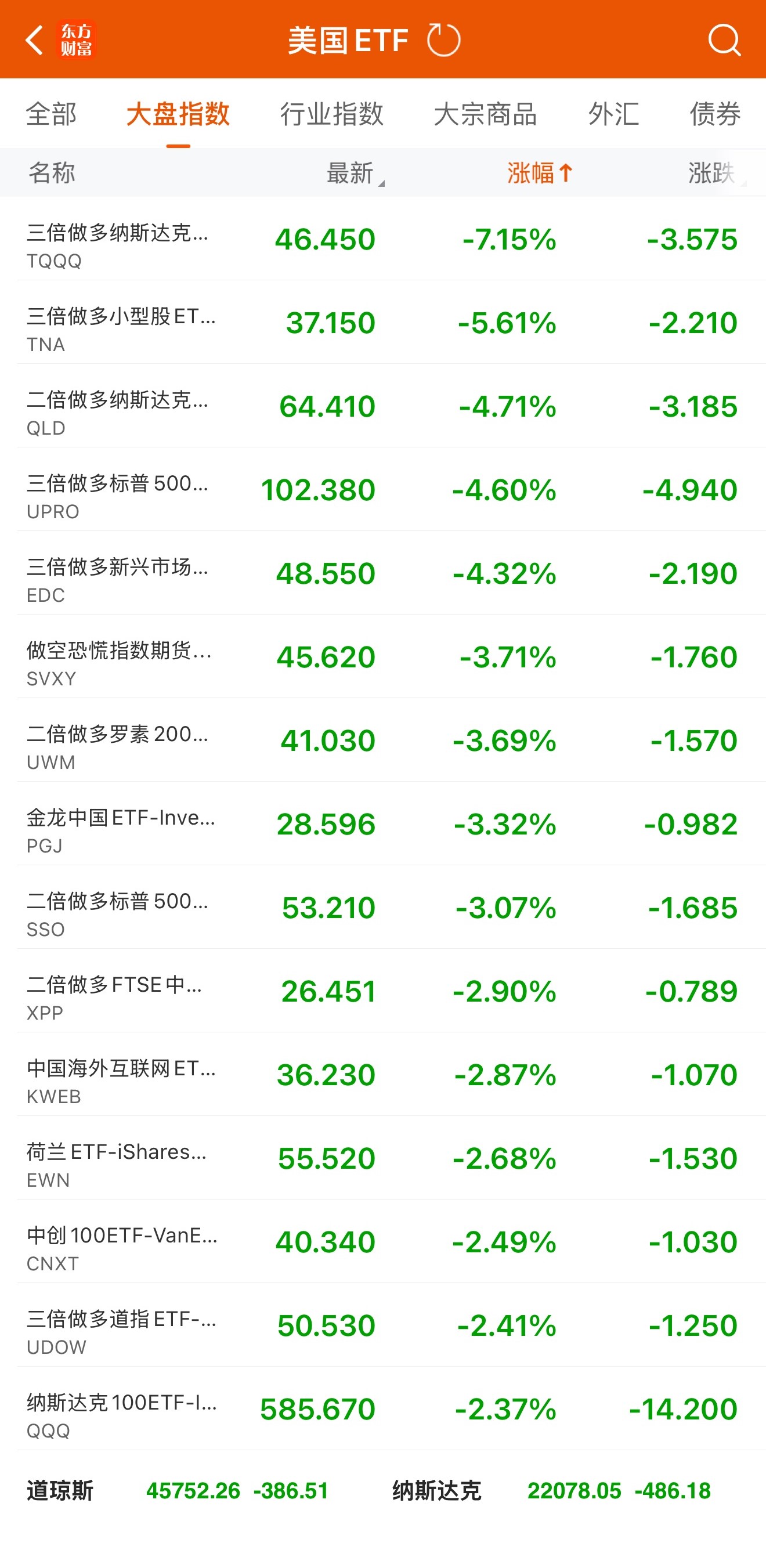 2倍做多纳斯达克100指数ETF-ProShares(QLD.US) 跌4.71%,成交额5.01亿美元。