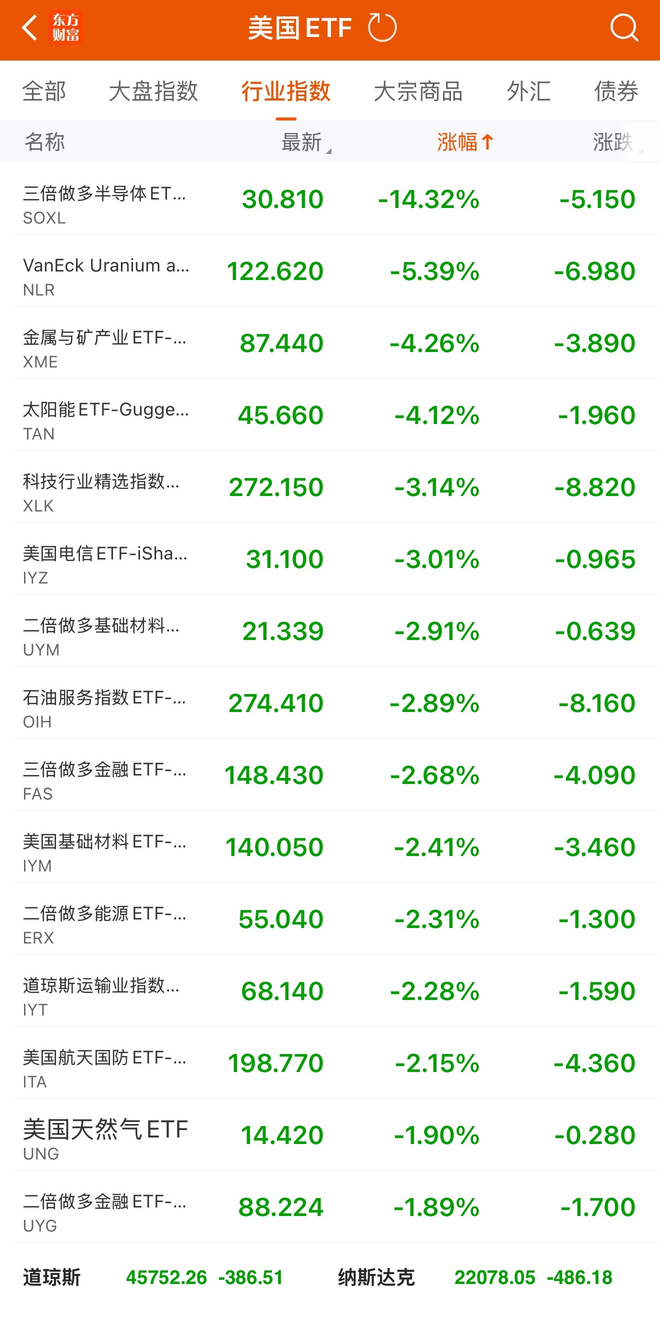 三倍做多半导体ETF-Direxion(SOXL.US) 跌14.32%,成交额76.07亿美元。