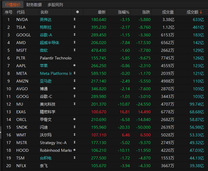 周四美股成交额第1名英伟达收跌3.15%,成交633亿美元。周四早间,英伟达股价一度上涨超过5%,最高上涨至196美元,但此后回吐早间涨幅并收跌3.15%,其股价由升转跌拖累了大盘。